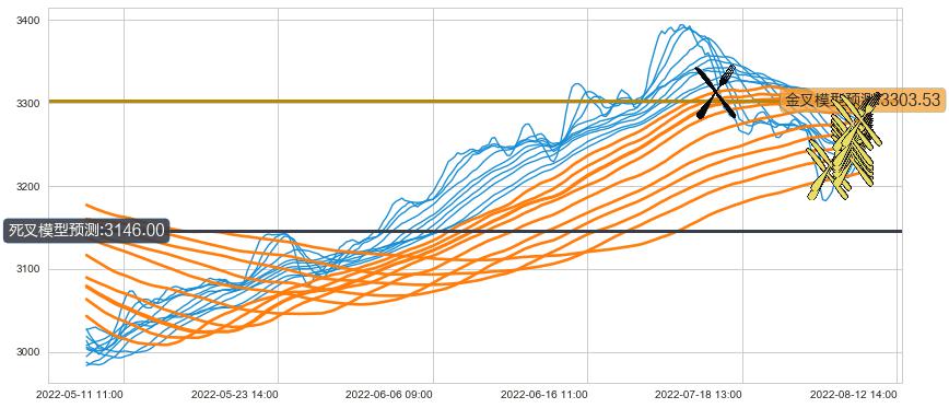 ➢ 13小时均线于(08-05 13:00: 3225.10)形成【金叉】基于【金叉历史模型】预测金叉后最高波峰价格: 3243.32, 金叉后最高价格3280.86,已经上涨超出预测最高波峰价格, 预期回调