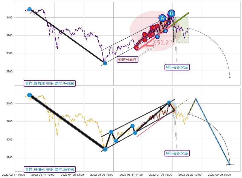 ➢ 2022-05-26 09:00-2022-07-05 13:00上升趋势存在反转[风险],其原上升趋势的支撑位(3446.51)已破位[强阻力信号],原上升趋势角度: 51.2˚