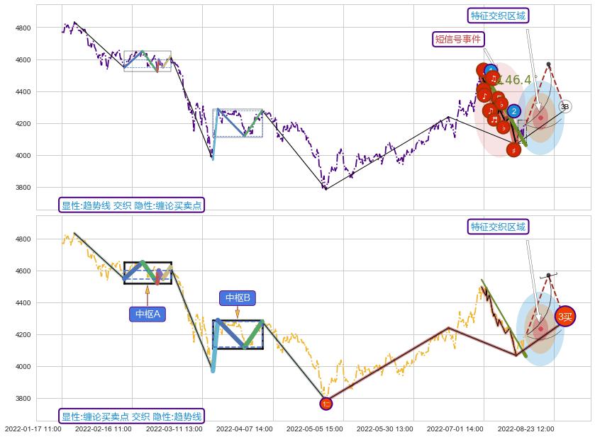 ➣ 缠论买卖点:上升缠:临近3卖-猜想击穿破位3卖后延续下跌趋势(大周期趋势均值回复后小周期持续趋势跟踪)