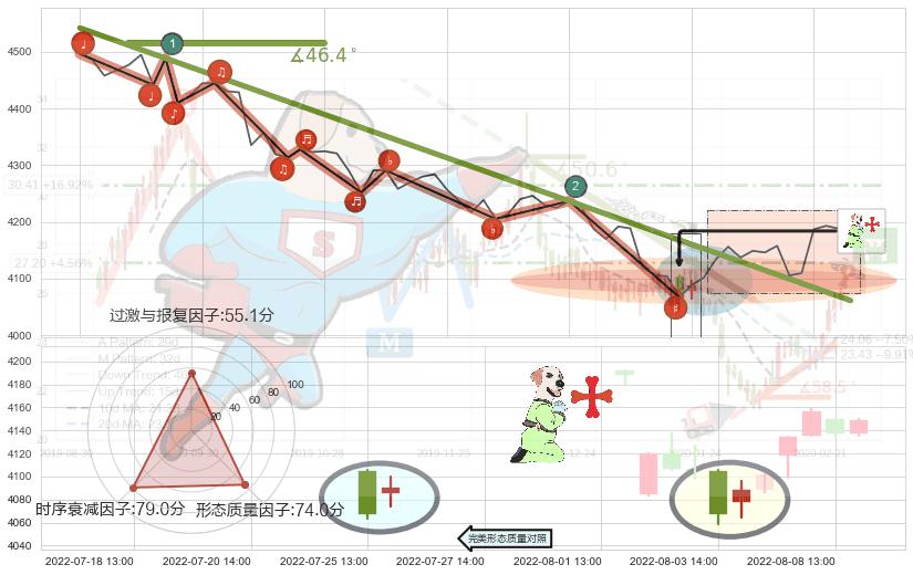 从2022-06-30 13:00至2022-08-11 13:00,共包含61个小时,阶段股价下跌-6.98%,阶段股价变动位移路程比: 1 : 4,下跌趋势角度: 46.4