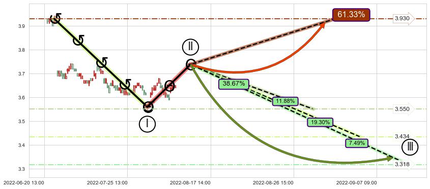 ➢ 循环浪继续向下【最低】位置(09-09:14, 3.318),匹配聚类样本比例19.37%, 可能性概率7.49%