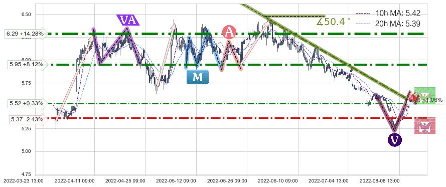🦴 长线均值回复组合短线趋势跟踪[强阻力信号]2022-05-05 14:00-2022-08-12 13:00下跌趋势依然成立(下跌趋势跟踪依然存在),短线价格略微上行反弹(均值回复猜想),即将接近下跌趋势提供的未破位阻力价格:5.56。