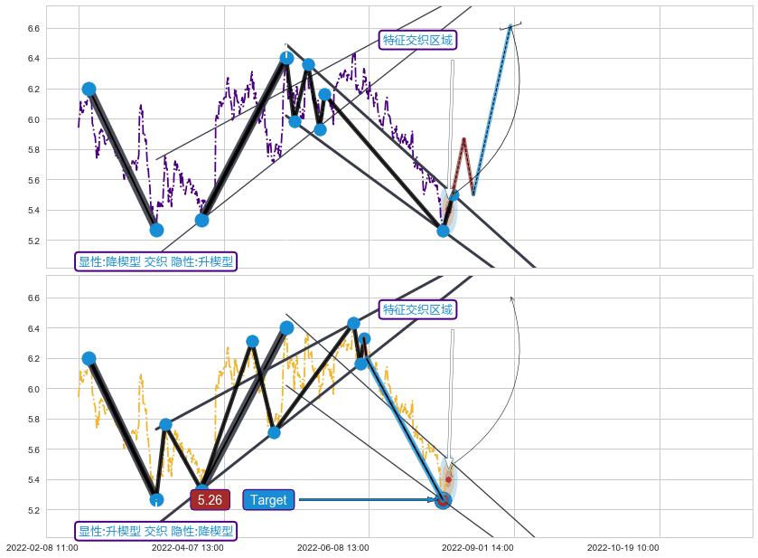 从2022-05-24 14:00至2022-06-07 10:00,共包含43个小时,阶段股价上涨6.39%,阶段股价变动位移路程比: 1 : 3
