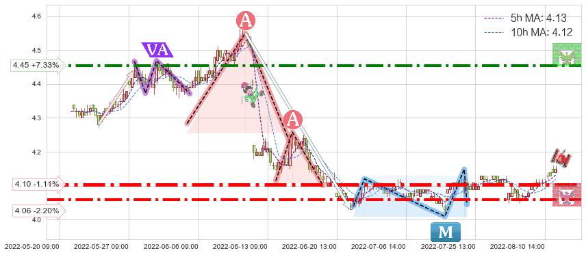 ♘ 阻力价格位4.45,可信任强度72.93%,距离最后交易2022-08-12 14:00形成的收盘价格4.15相差 +7.33%