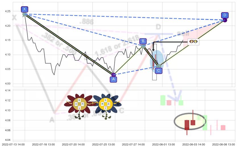 ➣ 未完成【蝙蝠】形态起点X: 06-15:13, 已到达C点: 08-03:14, 预测最终D点: 08-18:10, 共116交易小时