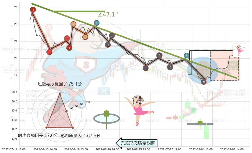 从2022-06-23 13:00至2022-08-10 14:00,共包含70个小时,阶段股价下跌-11.18%,阶段股价变动位移路程比: 1 : 3,下跌趋势角度: 44.4
