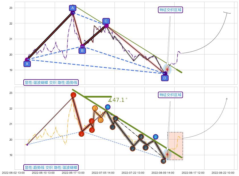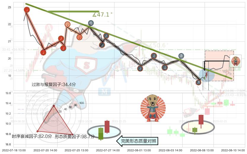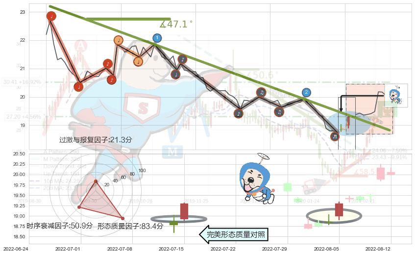 ➢ 2022-06-15 13:00-2022-08-10 14:00下跌趋势存在反转上涨[机会],其原下跌趋势的阻力位(18.83)已被突破[强支撑信号],原下跌趋势角度: 47.1˚