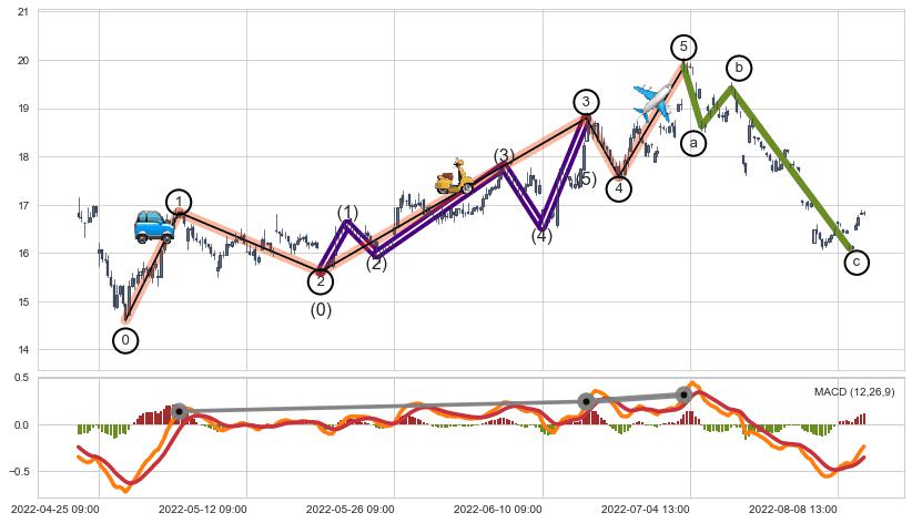 ➣ 波浪理论:猜想达到c点后小回调终止反转上涨 → 上涨 → 【拐点】临近 → 阶段均值回复结束后继续大周期趋势跟踪