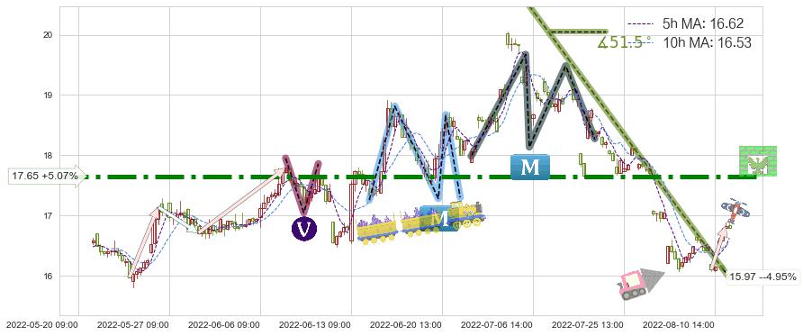 2022-06-13: 第一阻力位17.65强力阻拦了上升趋势,成功阻止了价格的继续上涨。