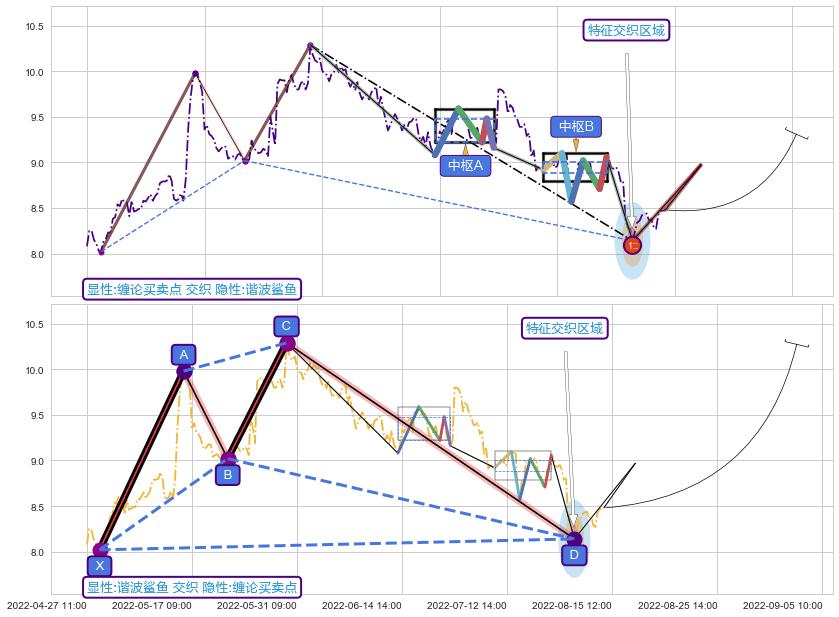 从2022-05-30 09:00至2022-08-12 13:00,共包含151个小时,阶段股价下跌-18.34%,阶段股价变动位移路程比: 1 : 6,下跌趋势角度: 22.6,2022-08-02 13:00向↘︎形成缺口,跳空下跌-4.89%˚