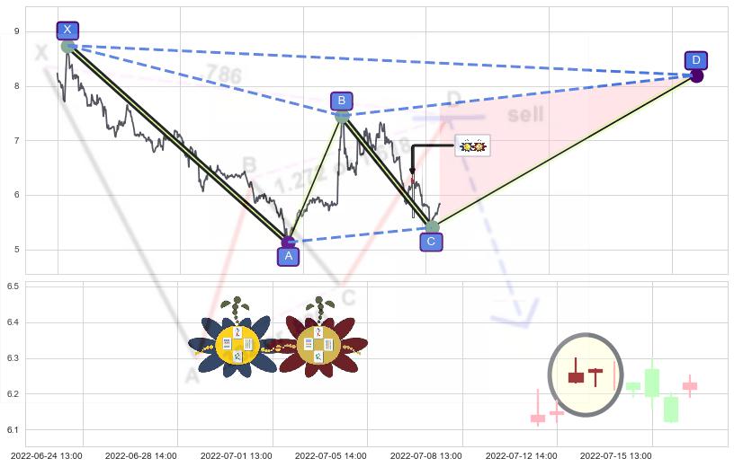 ➣ 谐波伽利:b下跌接近c:猜想支撑性拉升 → 上涨 →【拐点】支撑临近 → 大趋势均值回复