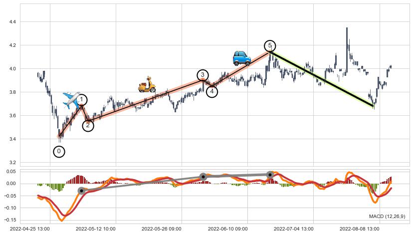 ➣ 波浪理论:猜想击穿破位c点后继续下跌 → 下跌 → 风险信号 → 小趋势跟踪