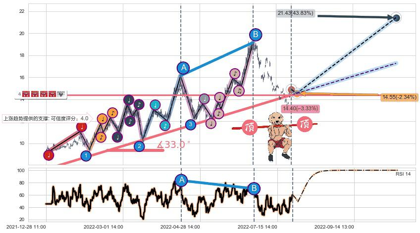 ♘ 在最后的上升阶段2021-12-30 13:00至2022-06-22 13:00存在 持续未破位的支撑位 ,支撑价格14.40,支撑可信任强度83.09%,其距离最后价格14.90相差 -3.33%
