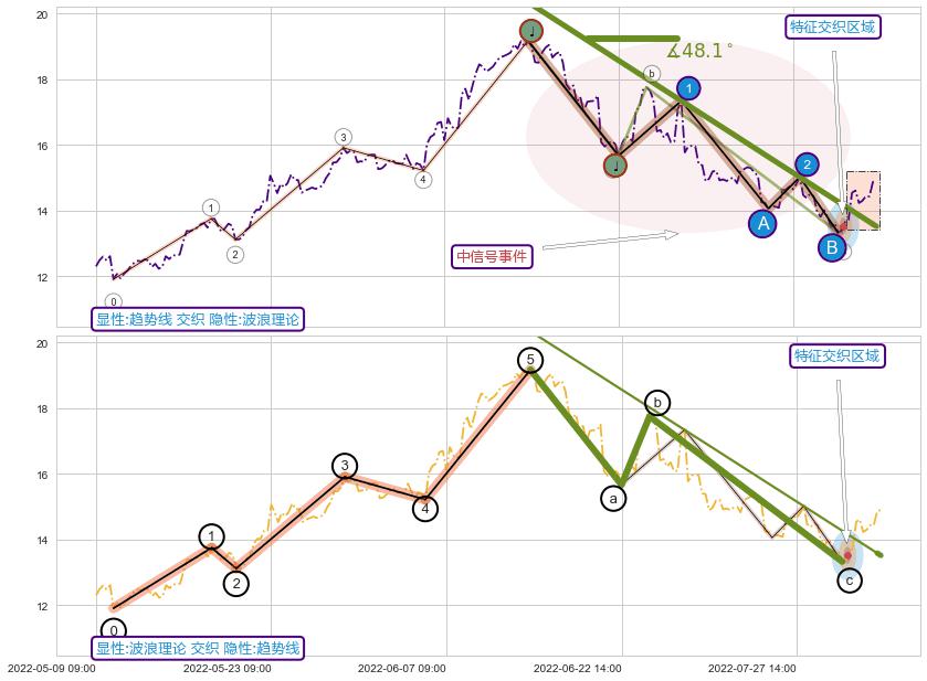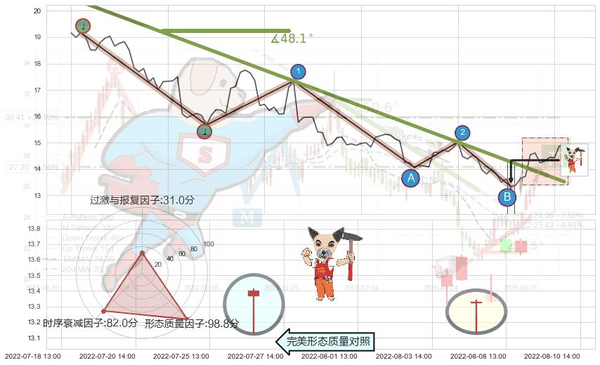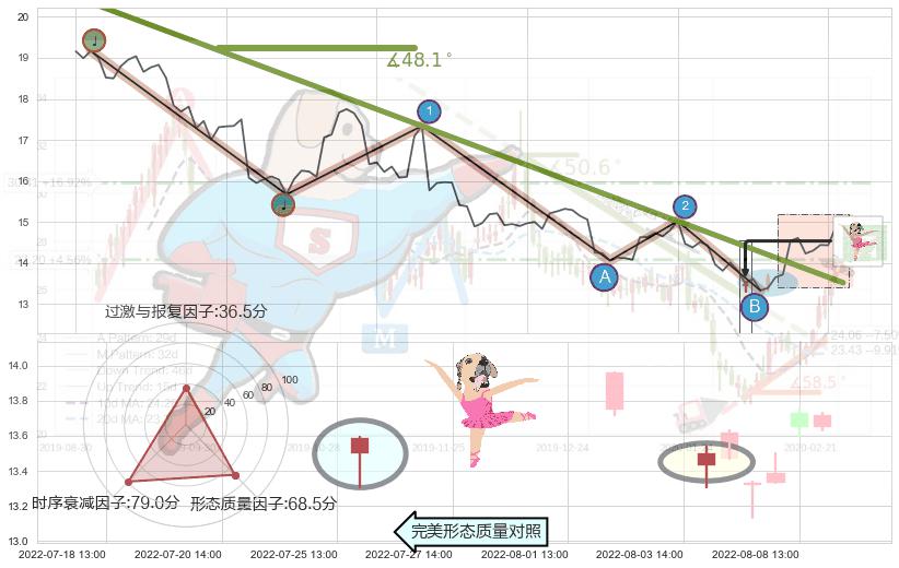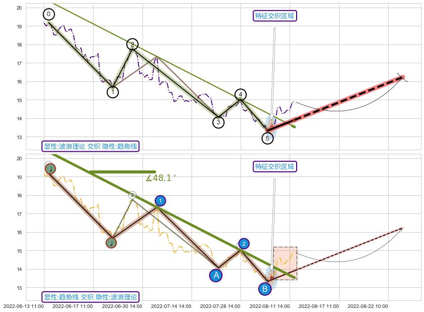➢ 2022-06-13 14:00-2022-08-12 13:00下跌趋势存在反转上涨[机会],其原下跌趋势的阻力位(13.52)已被突破[强支撑信号],原下跌趋势角度: 48.1˚