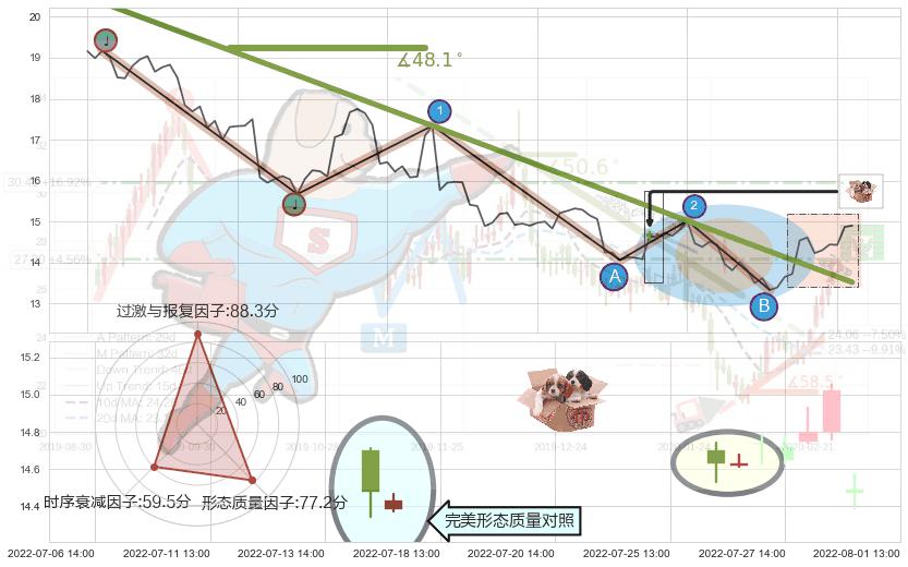 从2022-06-13 14:00至2022-08-12 13:00,共包含100个小时,阶段股价下跌-22.72%,阶段股价变动位移路程比: 1 : 6,下跌趋势角度: 48.1