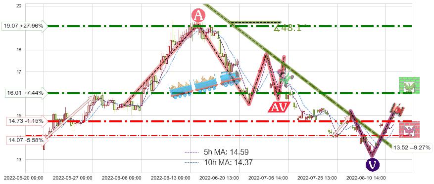 ♘ 阻力价格位19.07,可信任强度75.72%,距离最后交易2022-08-12 14:00形成的收盘价格14.90相差 +27.96%