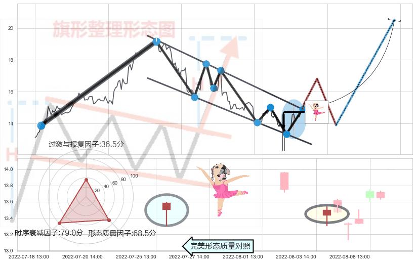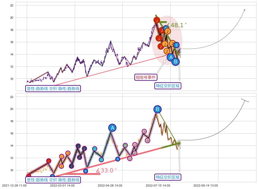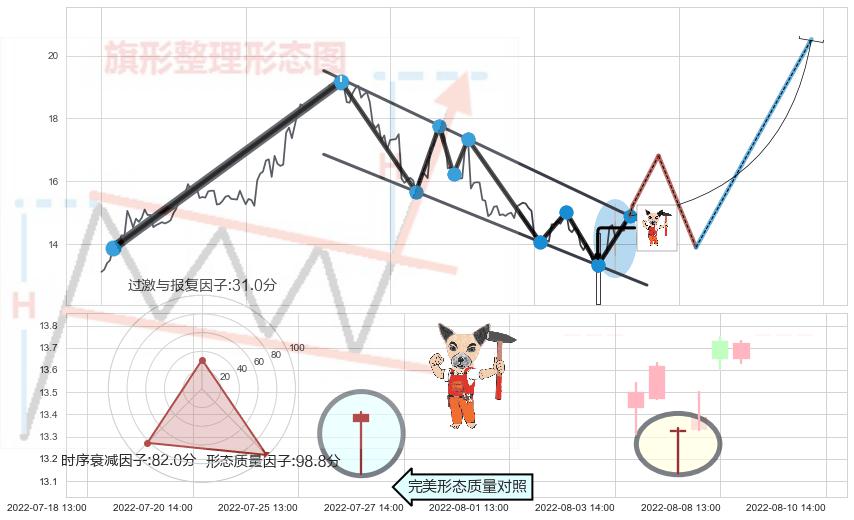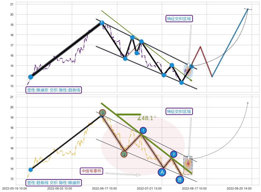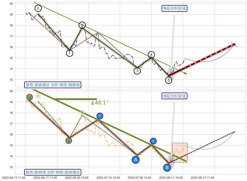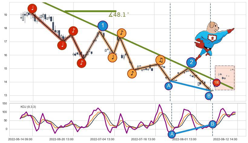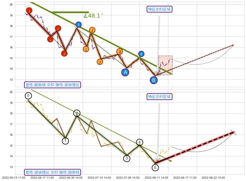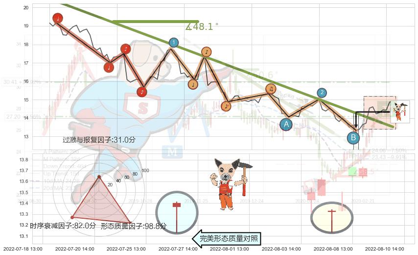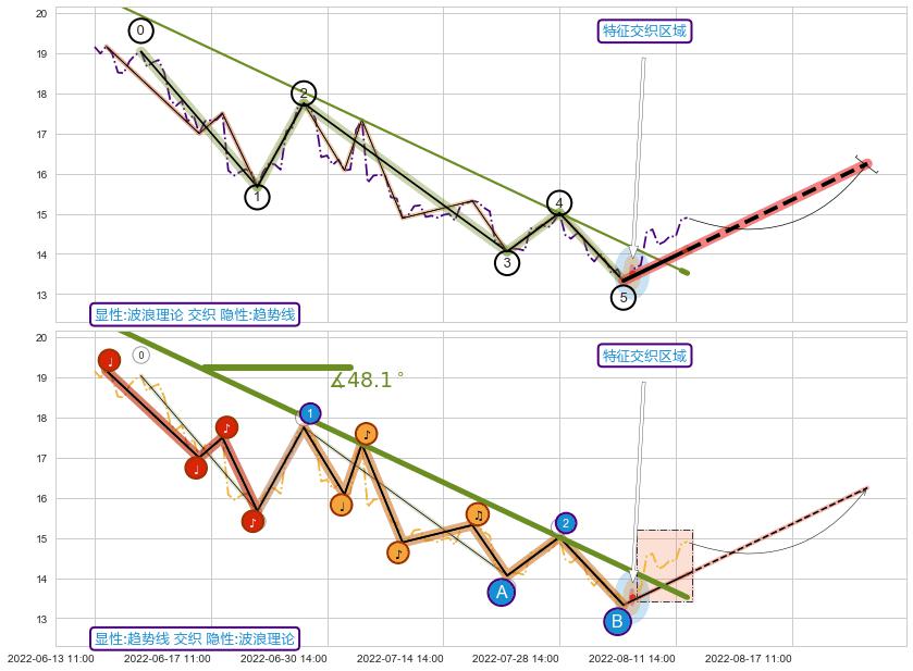 ➢ 2022-06-13 14:00-2022-08-12 13:00下跌趋势存在反转上涨[机会],其原下跌趋势的阻力位(13.52)已被突破[强支撑信号],原下跌趋势角度: 48.1˚