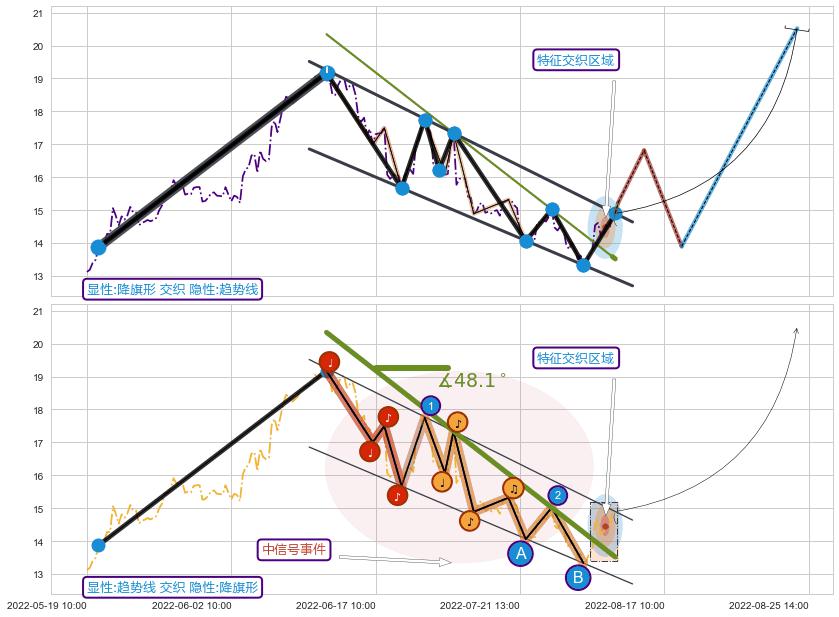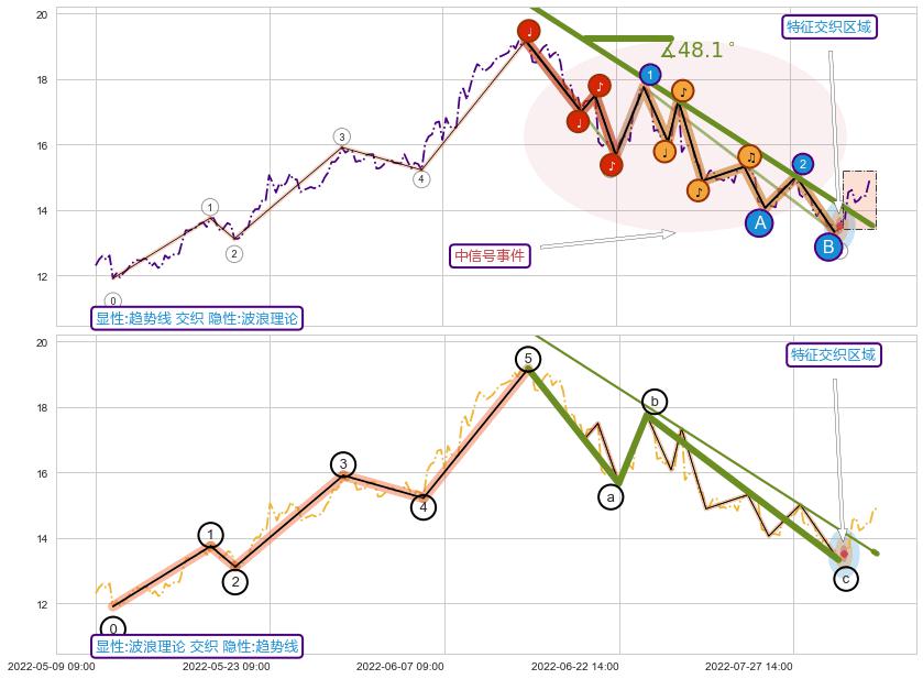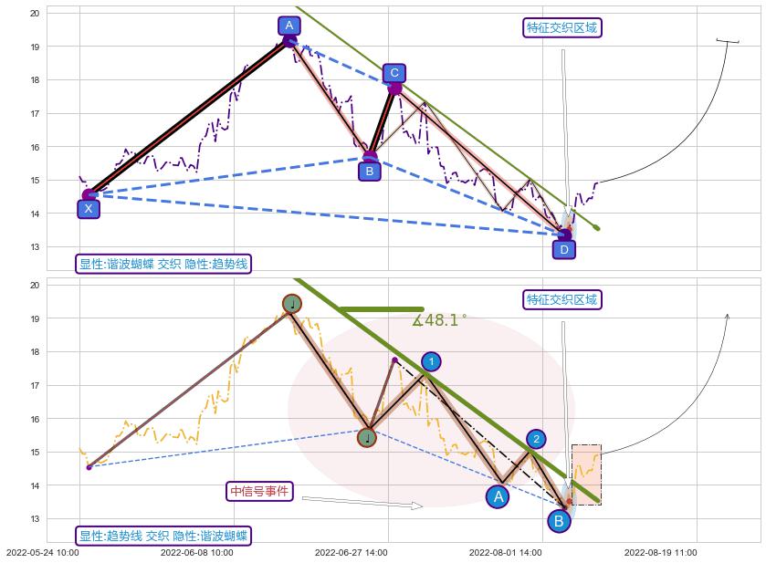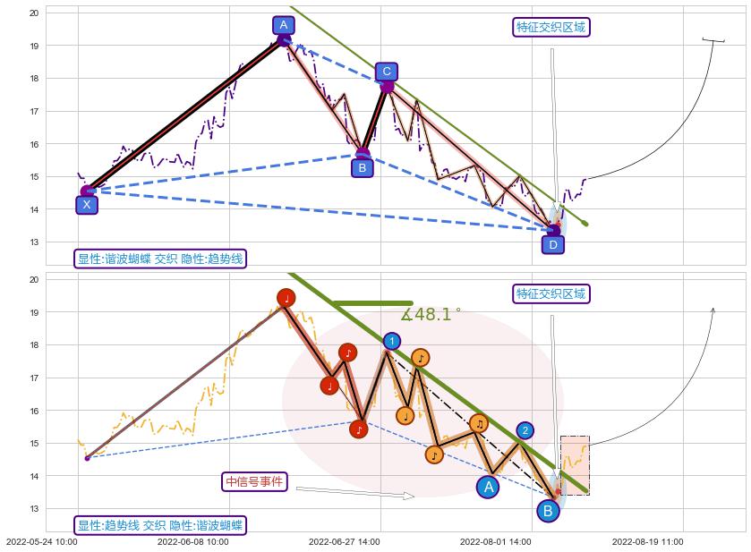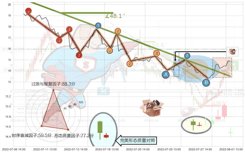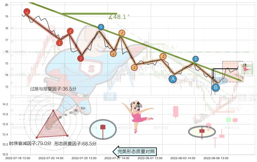 从2022-06-13 14:00至2022-08-12 13:00,共包含100个小时,阶段股价下跌-22.72%,阶段股价变动位移路程比: 1 : 6,下跌趋势角度: 48.1,2022-06-20 13:00向↘︎形成缺口,跳空下跌-8.11%˚