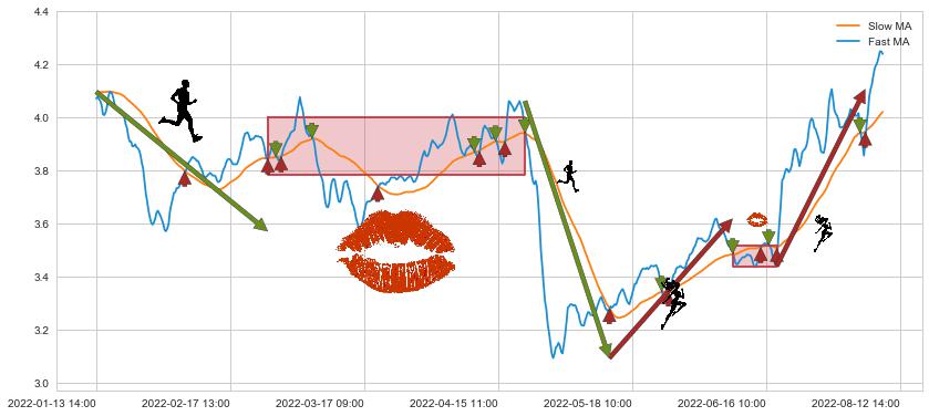 06-09 10:00至06-17 14:00 慢线与快线多次接触,存在上下穿越,有缠绕