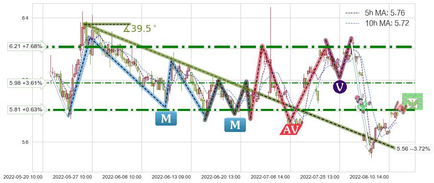➣ 【已达成】最小【整理】第一目标价格→(08-03:14: 5.58 ), 后续继续【整理】下跌动力依然存在,下跌空间适中