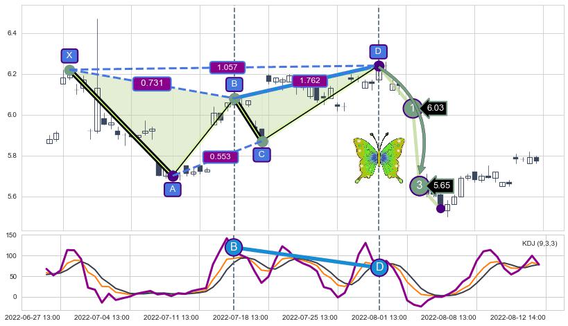 ➣ 已完成【蝴蝶】形态起点X: 06-27:14, 终点D: 07-28:13, 共46交易小时