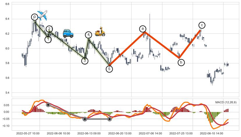 ➣ 第一, 三, 五浪下跌动能逐渐【衰弱变小】,趋势呈现不稳迹象