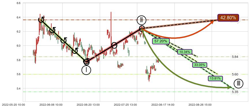 ♘ 阻力价格位5.98,可信任强度49.61%,距离最后交易2022-08-12 14:00形成的收盘价格5.77相差 +3.61%