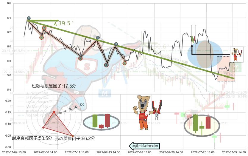 从2022-05-26 11:00至2022-06-27 13:00,共包含90个小时,阶段股价下跌-2.42%,阶段股价变动位移路程比: 1 : 27,下跌趋势角度: 39.5