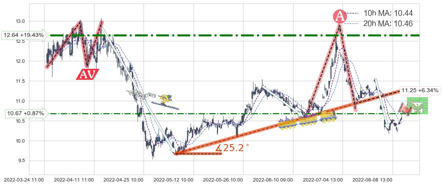 ♘ 阻力价格位10.67,可信任强度42.20%,距离最后交易2022-08-12 14:00形成的收盘价格10.58相差 +0.87%