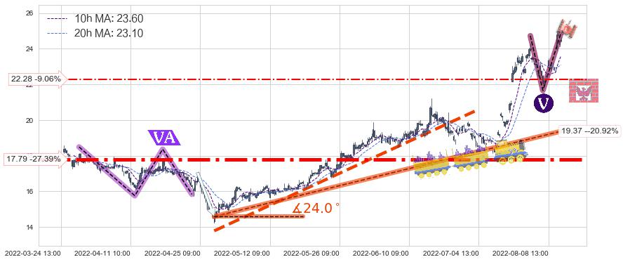 ♘ 在最后的上升阶段2022-04-27 09:00至2022-08-12 14:00存在 持续未破位的支撑位 ,支撑价格19.37,支撑可信任强度82.28%,其距离最后价格24.50相差 -20.92%