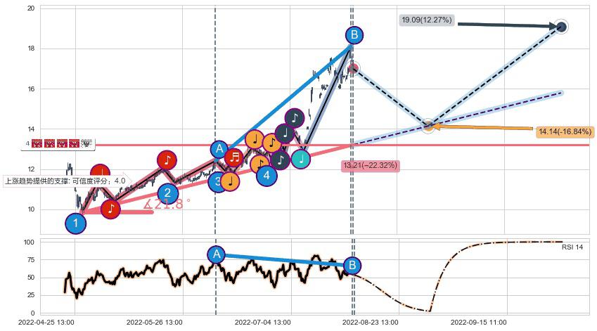 ➢ 预测:2022-08-30 12:00,【小幅回撤】稳定目前上涨趋势的前提下,预测价格:14.14