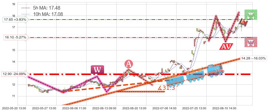 ♘ 阻力价格位17.65,可信任强度54.88%,距离最后交易2022-08-12 14:00形成的收盘价格17.00相差 +3.83%