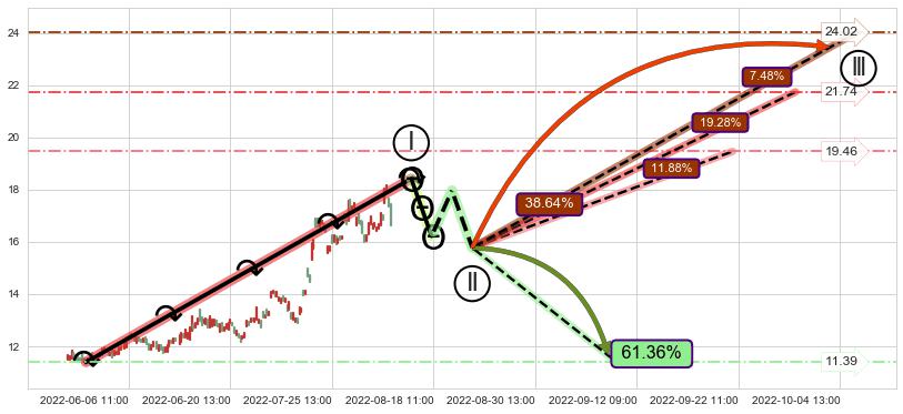 从2022-05-23 09:00至2022-06-10 15:00,共包含73个小时,阶段股价上涨2.25%,阶段股价变动位移路程比: 1 : 22