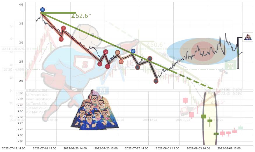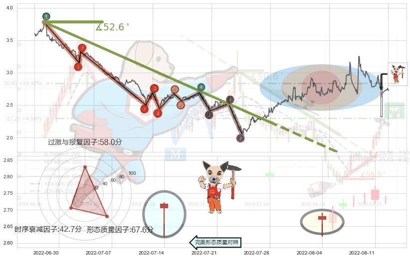 从2022-04-27 09:00至2022-08-03 14:00,共包含236个小时,阶段股价上涨34.10%,阶段股价变动位移路程比: 1 : 8,上涨趋势角度: 33.0