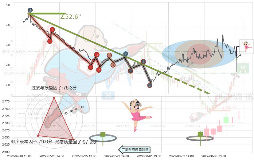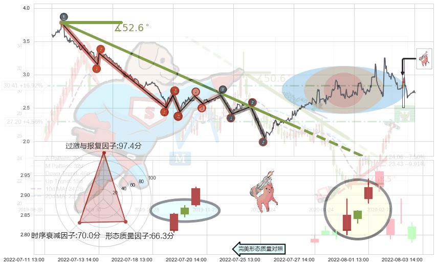 从2022-01-13 09:00至2022-05-12 14:00,共包含382个小时,阶段股价下跌-46.15%,阶段股价变动位移路程比: 1 : 6,下跌趋势角度: 52.6
