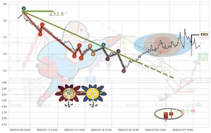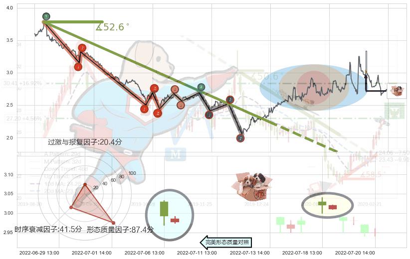 从2022-04-27 09:00至2022-07-05 14:00,共包含195个小时,阶段股价上涨31.85%,阶段股价变动位移路程比: 1 : 6,上涨趋势角度: 38.9