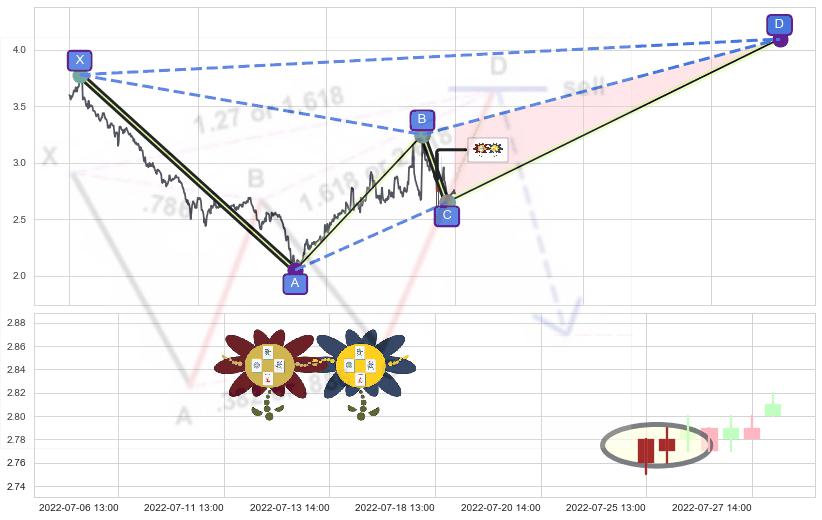➢ 谐波蝴蝶:b下跌接近c:猜想支撑性拉升 → 上涨 →【拐点】支撑临近 → 大趋势均值回复