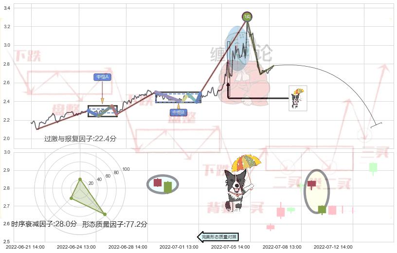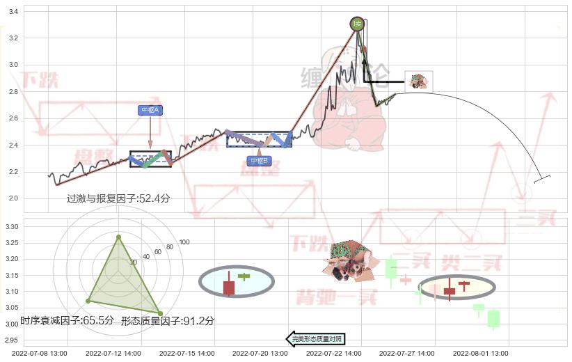 从2022-04-27 09:00至2022-08-03 13:00,共包含235个小时,阶段股价上涨28.86%,阶段股价变动位移路程比: 1 : 7,上涨趋势角度: 19.7,2022-07-25 13:00向⇪形成缺口,跳空上涨+10.07%