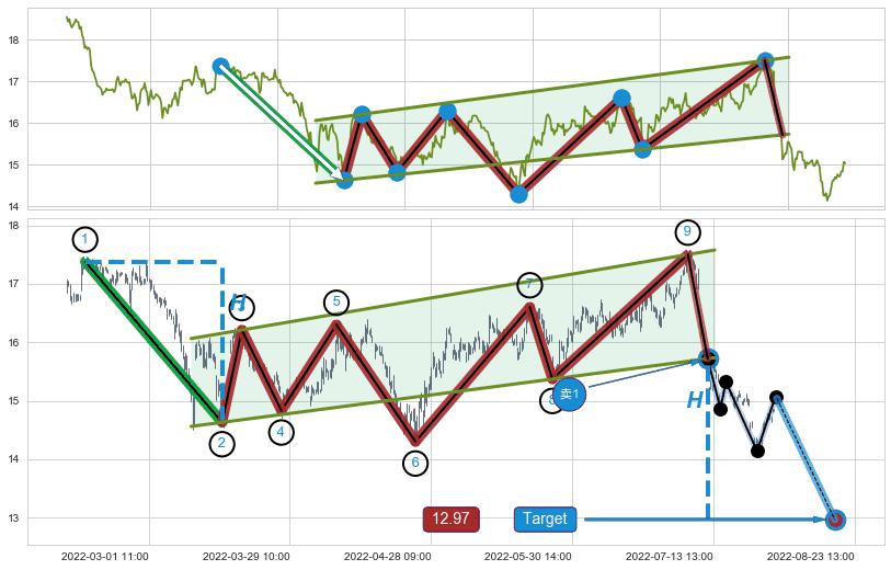 ➢ 最小反转跌幅→𝐇: 2.533 (逐步抬高阻力斜边最后的阻力点⑧与支撑边垂直距离)
