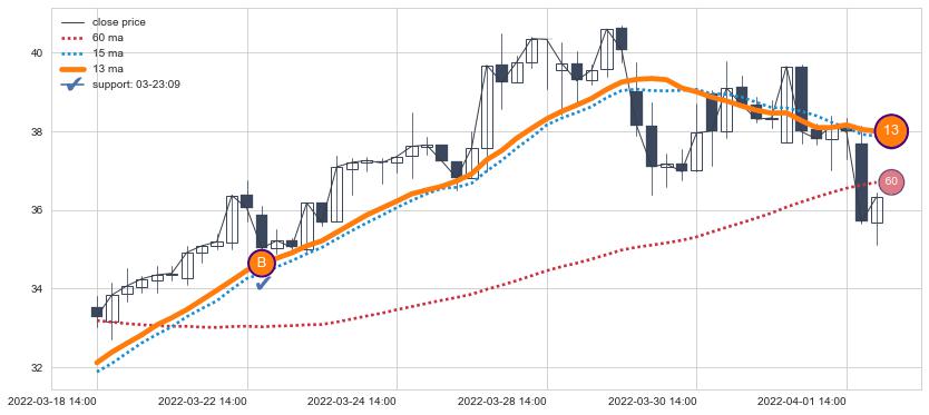 03-18 14:00至04-06 10:00 慢线与快线呈多头排列, 慢线与快线接触少,无缠绕