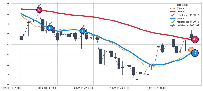 04-15 11:00至05-05 09:00 慢线与快线呈空头排列, 慢线与快线接触少,无缠绕