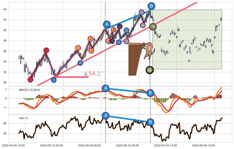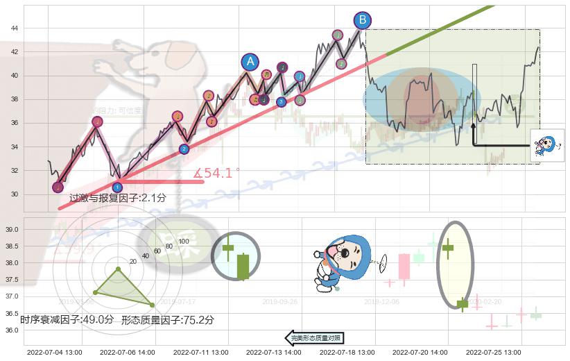 从2022-06-22 14:00至2022-07-22 14:00,共包含45个小时,阶段股价上涨3.85%,阶段股价变动位移路程比: 1 : 17