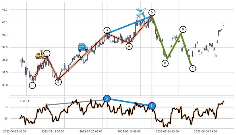 ➣ 【RSI】缠论走势出现【常规背离 & 反转信号】背离程度63.73%,背离夹角角度76.6˚,背离程度较大