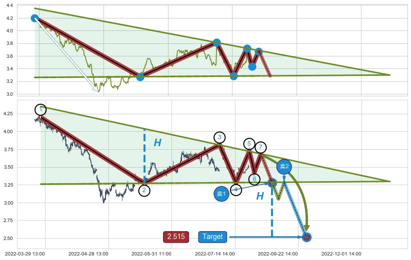 ➣ 下降对称三角整理:猜想临近关键支撑位突破点 → 临近拐点下跌 → 风险信号 → 大趋势均值回复