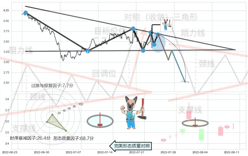 ➢ 扩散三角反转临近支撑猜想转换阻力下跌 🔜 下降对称三角整理临近支撑猜想转换阻力下跌 综合量化分数:38.12 【偏空】