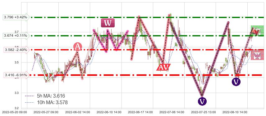 ♘ 阻力价格位3.674,可信任强度70.84%,距离最后交易2022-08-12 14:00形成的收盘价格3.670相差 +0.11%