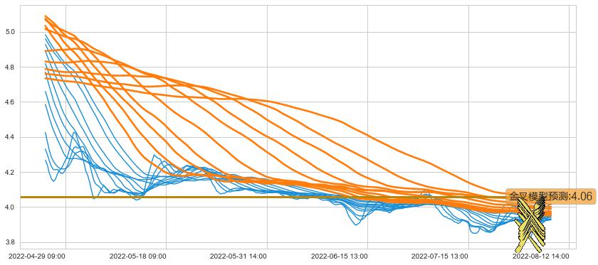 ➢ 45小时均线于(08-05 14:00: 3.910)形成【金叉】基于【金叉历史模型】预测金叉后最高波峰价格: 4.07, 金叉后最高价格4.03,尚未达到预测最高波峰价格, 预期继续上涨