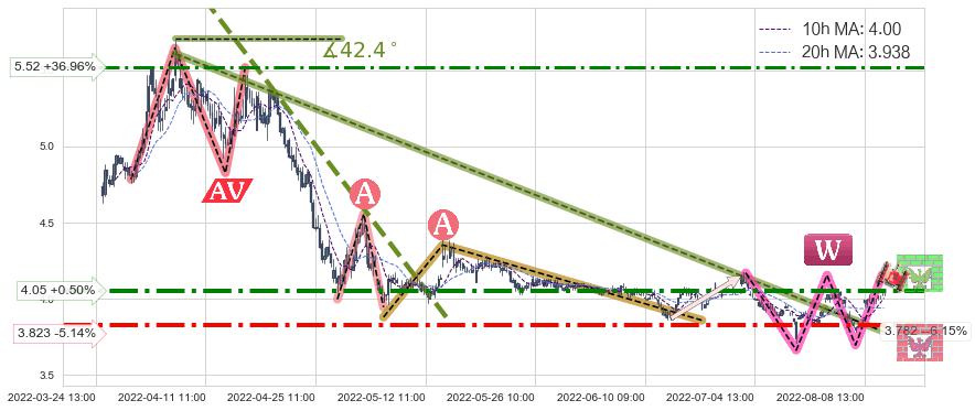 ♘ 阻力价格位4.05,可信任强度72.18%,距离最后交易2022-08-12 14:00形成的收盘价格4.03相差 +0.50%