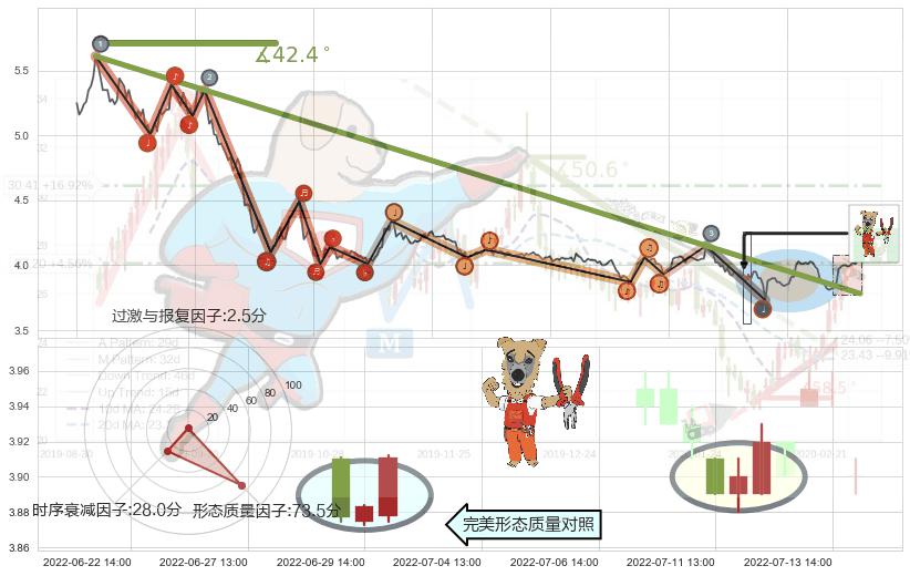 从2022-04-06 13:00至2022-07-26 13:00,共包含297个小时,阶段股价下跌-31.97%,阶段股价变动位移路程比: 1 : 7,下跌趋势角度: 42.4