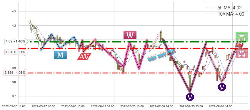 ♘ 阻力价格位4.09,可信任强度96.00%,距离最后交易2022-08-12 14:00形成的收盘价格4.03相差 +1.40%